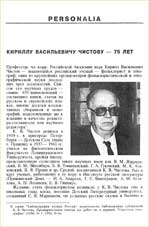 Профессор, чл.-корр. Российской академии наук Кирилл Васильевич Чистов - выдающийся российский ученый - фольклорист и этнограф, один из крупнейших организаторов фольклористической и этнографической науки последних трех десятилетий. Список его научных трудов - свыше 450 наименований - составляют книги, статьи на русском и европейских языках, многие десятки коллективных сборников и монографий, подготовленных им к изданию в качестве редактора-составителя или научного редактора.