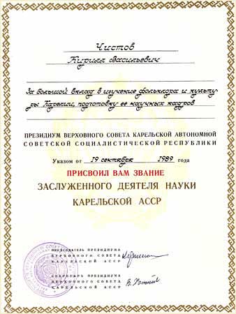 Заслуж.деятель науки Карельской АССР 1989 (грамота 2)